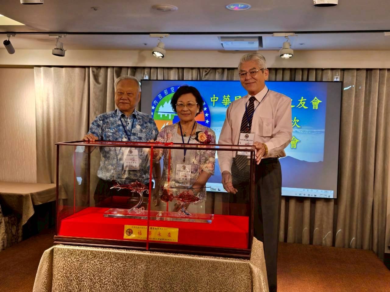 會中空勤總隊井延淵總隊長,致贈周芳如理事長紀念品,感謝周理事長五年多的照顧關懷空勤總隊;並致贈蔡信夫前理事長夫人蔡顏錦秀女士、劉燈發常務監事、陳朝日副理事長、江容娥副理事長等有功人員紀念品,感謝其對空勤總隊的照顧關懷。