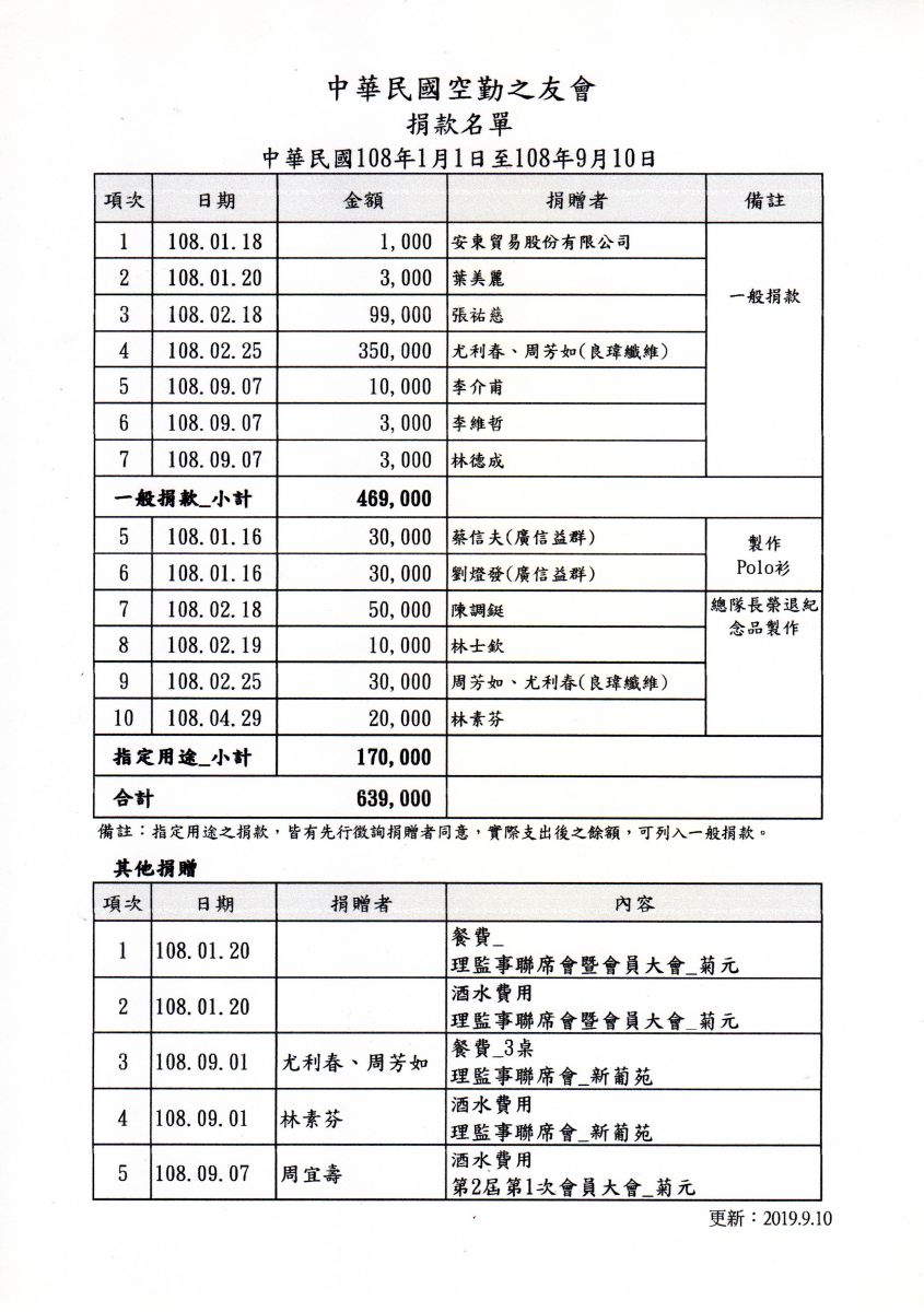 中華民國空勤之友會捐款芳名錄(108.01.01-108.09.10)