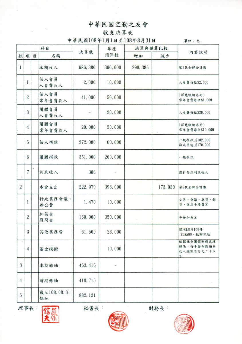 中華民國空勤之友會108年度收支決算表(108.01.01-108.08.31)