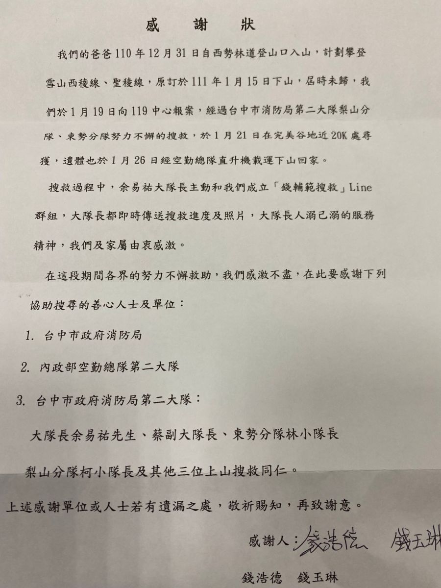 2022.02.14空勤總隊接獲山難家屬感謝函 鼓舞及溫暖空勤總隊同仁士氣