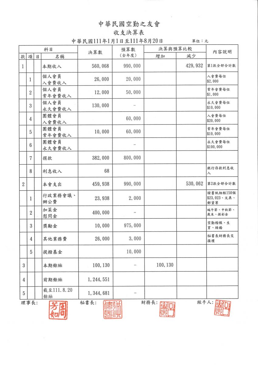 中華民國空勤之友會111年度收支決算表(111.01.01-111.08.20)
