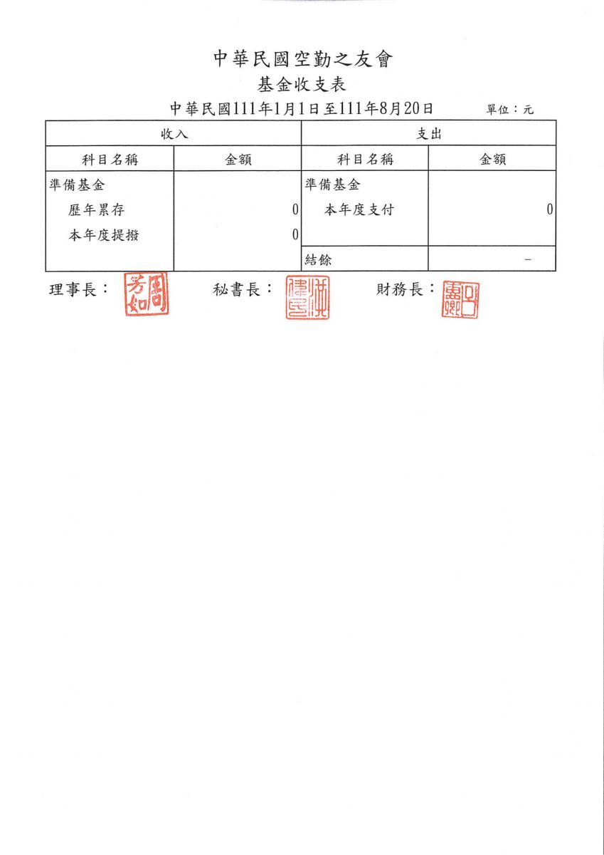 中華民國空勤之友會111年度基金收支表(111.01.01-111.08.20)