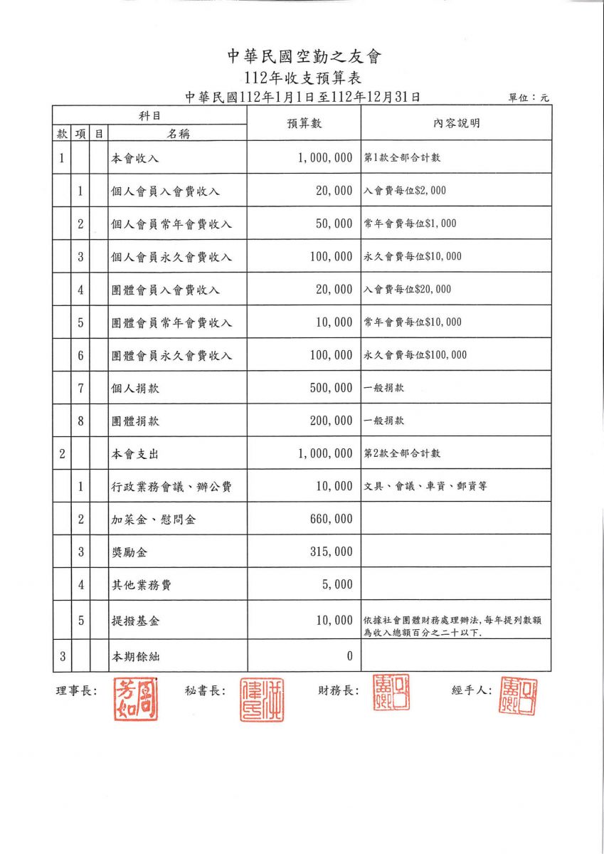 中華民國空勤之友會112年度收支預算表(112.01.01-112.12.31)
