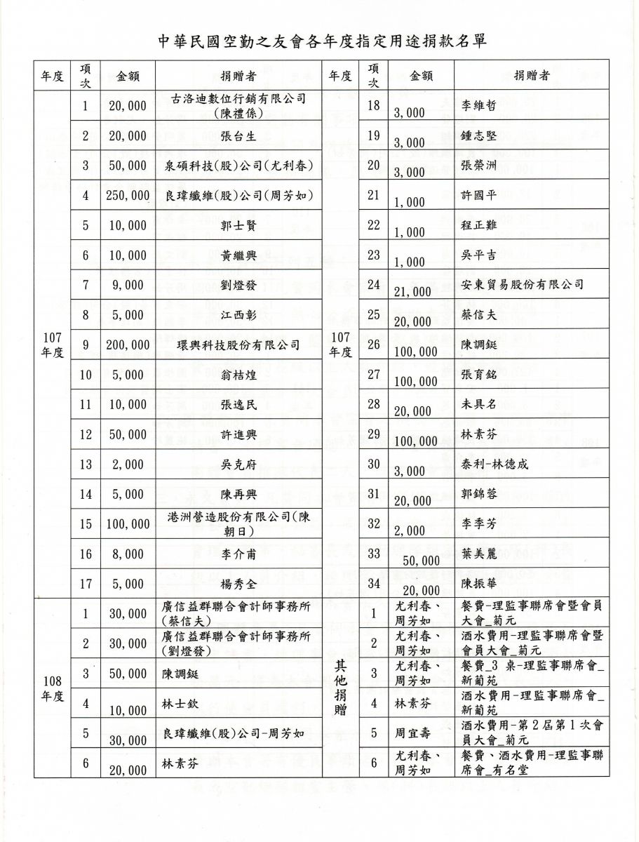 中華民國空勤之友會各年度指定用途捐款名單(107年-108年)