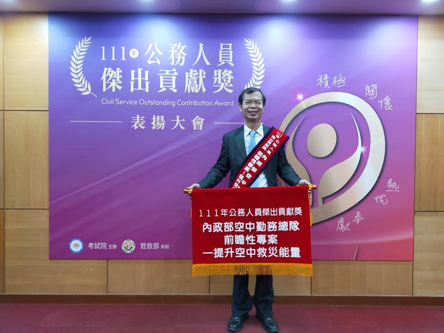 2022.12.13內政部空中勤務總隊榮獲考試院111年度公務人員傑出貢獻獎的團體獎(號稱公務界奧斯卡),今日總統蔡英文親自頒獎,由主任秘書鄭問堂代表領獎。