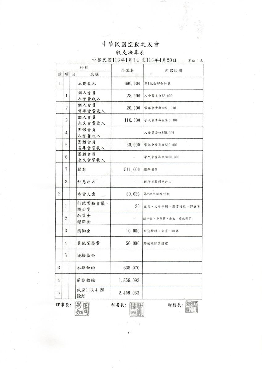 中華民國空勤之友會113年度收支決算表(113.01.01-113.04.20)