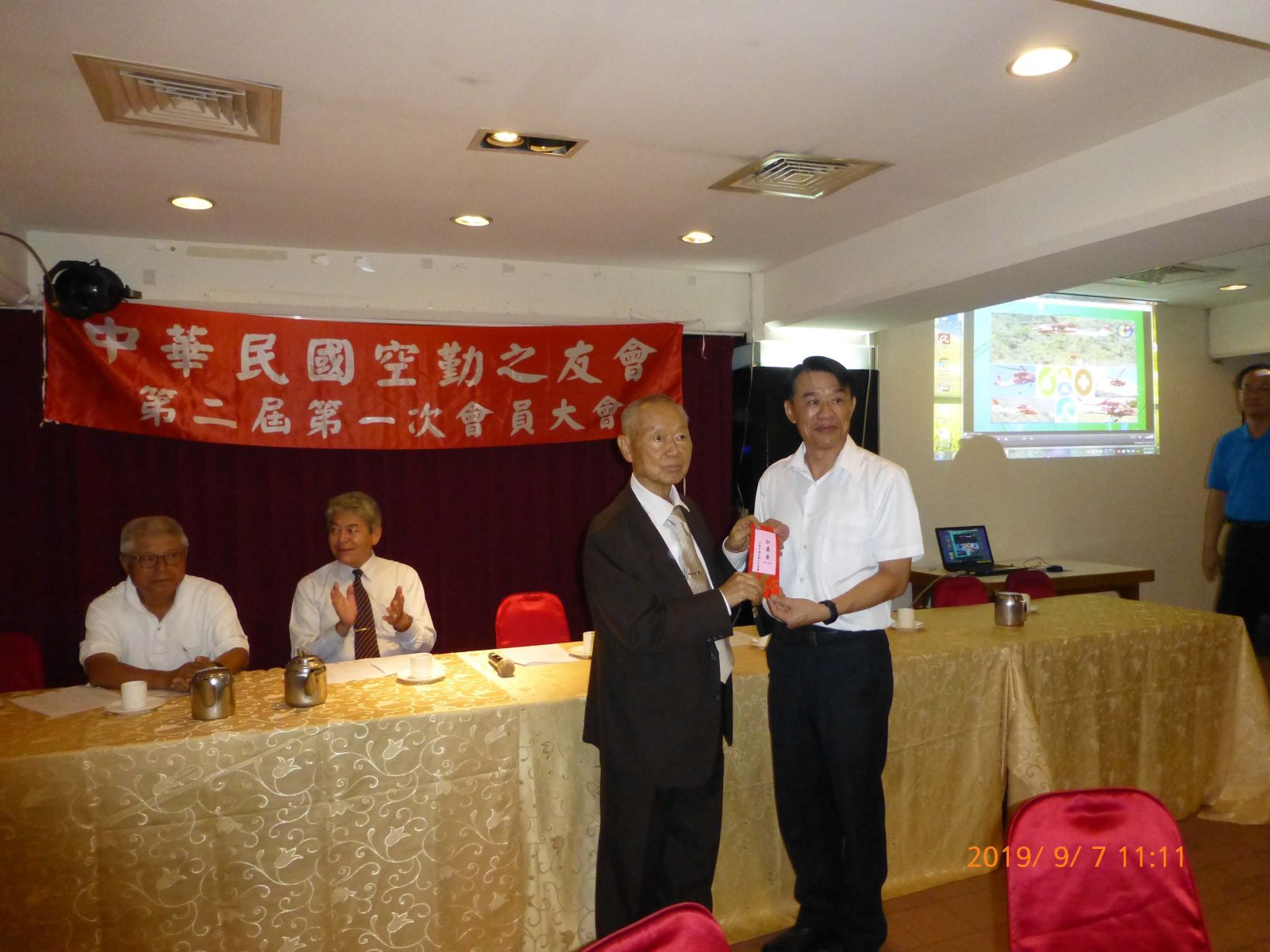 會中由蔡信夫理事長致贈中秋佳節慰勞加菜金20萬元,給空勤總隊同仁們,以感謝它們救災的辛苦,由黃明宮隊長代表接受。